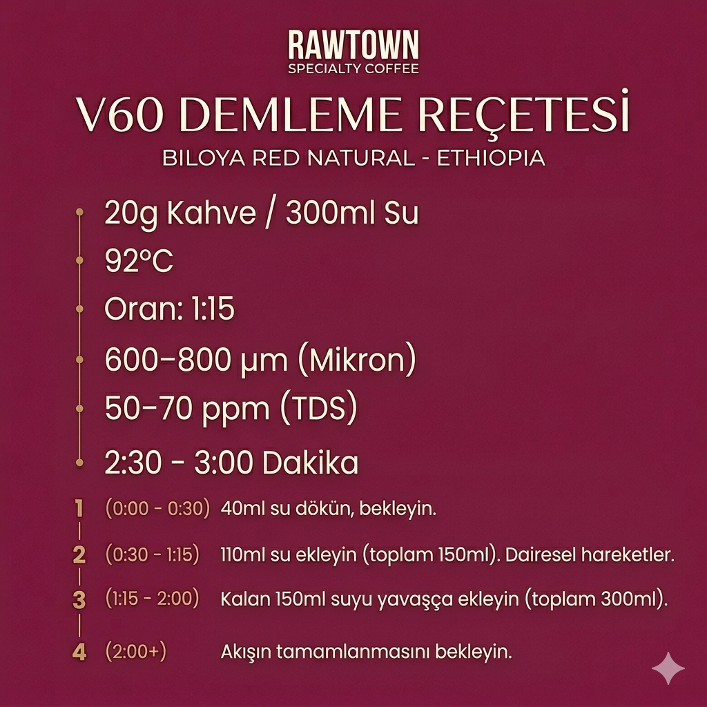 Bu özel kahvede frenk üzümü, ahududu ve çilek notaları ön plana çıkar. Meyvemsi aromalarıyla dikkat çeken Ethiopia Biloya Red, hafif gövdesi ve parlak, canlı asiditesi ile dengeli ve ferahlatıcı bir içim sunar. Özellikle meyvemsi ve aromatik kahveleri tercih edenler için ideal bir seçenektir.